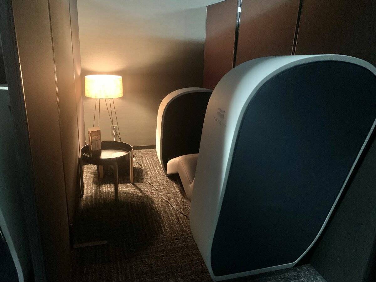 シートに腰を下ろすと、カーテンが閉まり室内は一気に真っ暗に。眠気を誘うヒーリング音楽が流れ、背中がゆっくり押されるように動きます。まるでマッサージを受けているような感覚で、自然と体の力が抜けていきました。