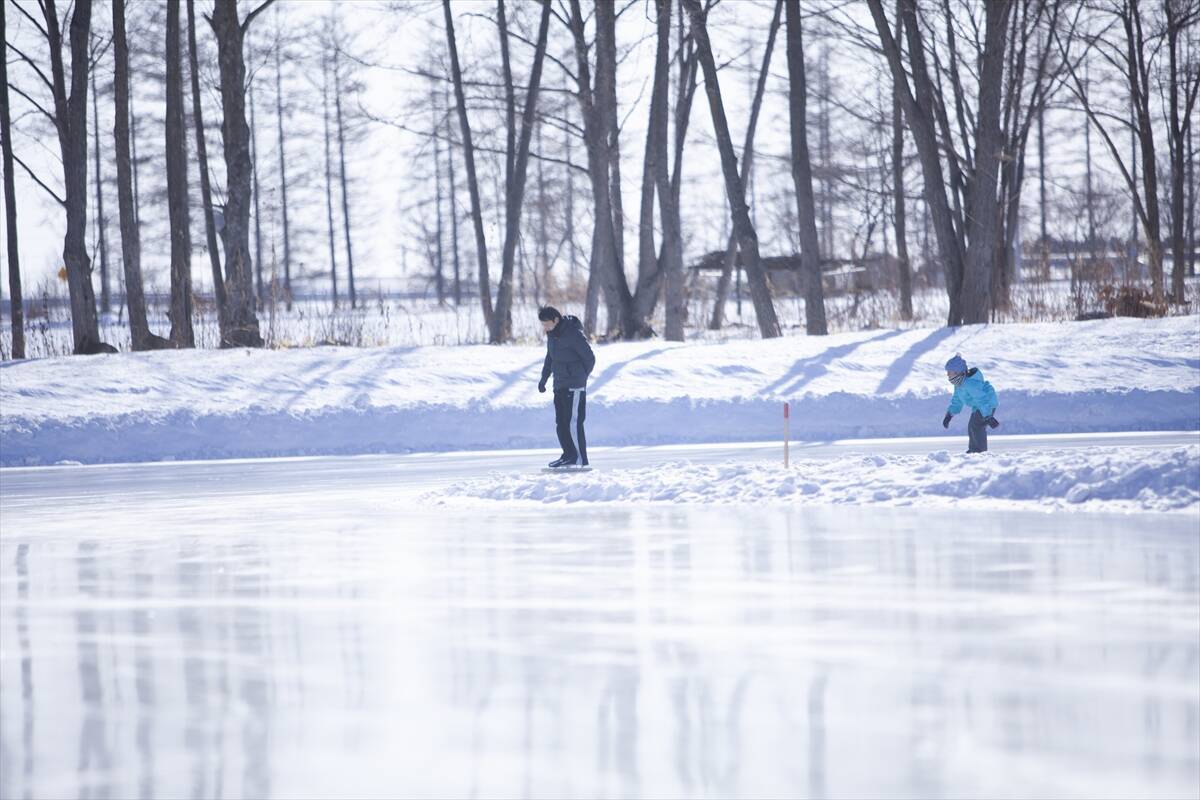 まるで池の上に浮かんでいるような開放感あふれるロケーションが魅力。冬の澄んだ空気の中、太陽の光が反射する透明感のある氷の上を滑ると、屋内では味わえない特別な爽快感を味わえます。