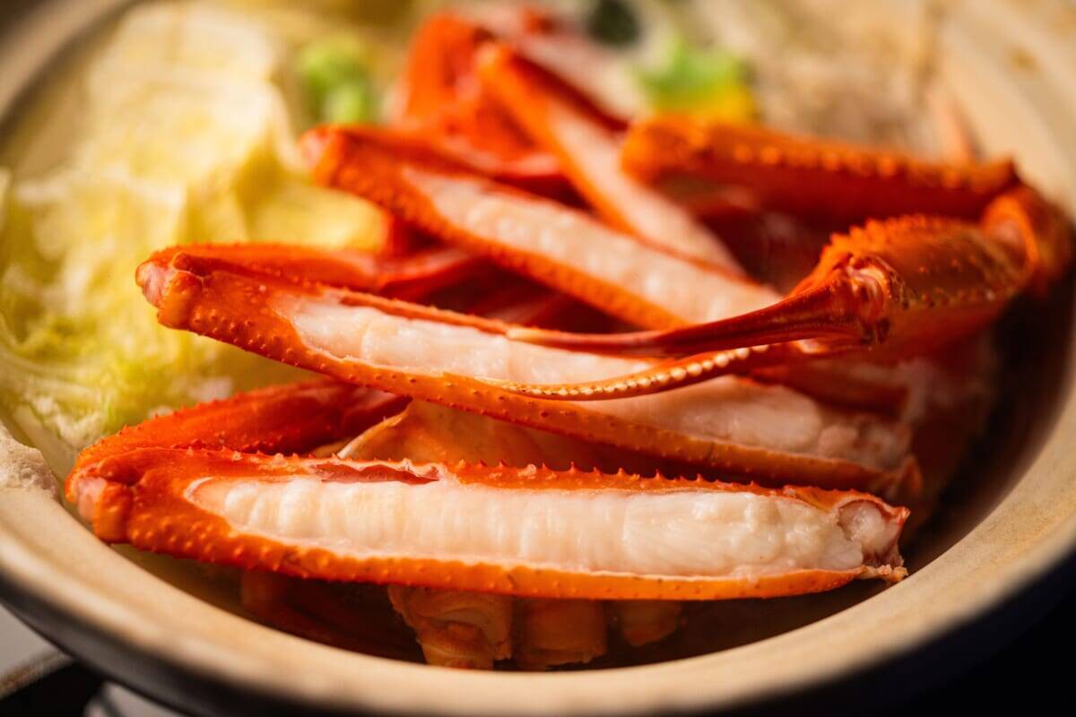“香住港で水揚げされた紅ズワイガニ”であることを証明するタグが付いた「香住ガニ」を、2匹まるごと贅沢に味わうフルコース。「カニすき」「炭火焼」「蒸しガニ」「カニ刺し」「天ぷら」の五大定番の技法で、香住ガニの旨みと香りを余すことなく引き出します。