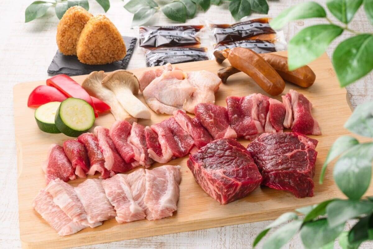 カルビ50g、豚肩ロース100g、鶏100g、つくね50g、ソーセージ、焼きおにぎり、焼き野菜、焼き肉のたれ