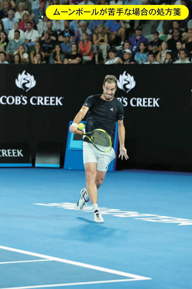 山なりのボールで、スピードがないムーンボール。体の横向きを維持したままスイングしよう。また、この時に左手を後ろに引くことも大切だ。ゆっくりなボールに対して、スピンをかけて思い切り打ちたい気持ちが出てくるものだが、そうするとスイングと同時に体が回りやすく不安定なショットになってしまうのだ。