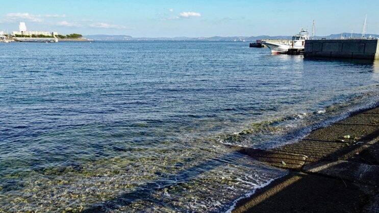 「西浦賀みなと緑地」には木製の階段デッキがあり四阿(あずまや)も作られています。しかしここは「陸軍桟橋」の歴史を後世に伝えるための歴史遺産なのです。このL字形の桟橋が「陸軍桟橋」です。