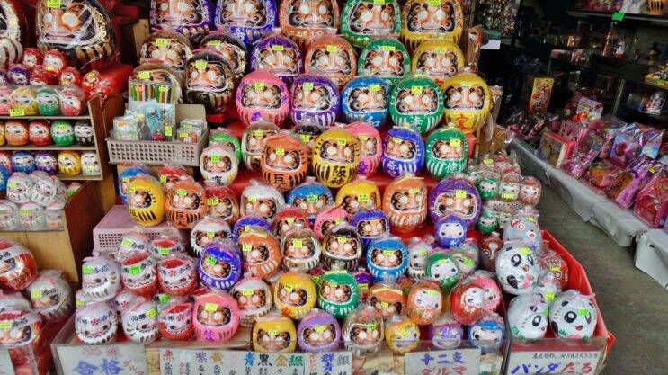トップ画像、こちらは12色のダルマ。「パンダ」「阪神」「巨人」ダルマもあります。