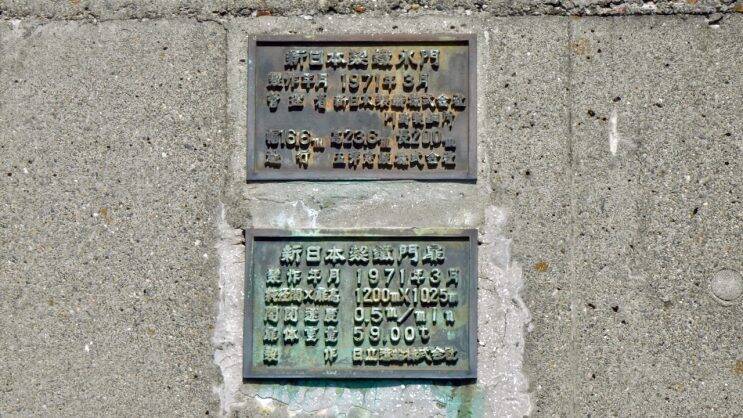 銘板がありました。名称は「新日本製鐵水門」1971年(昭和46年)3月に作られています。管理者は新日本製鐵株式会社川崎製綱所。