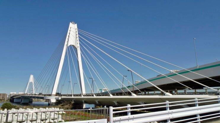 大師橋です。2つの塔から左右に7本ずつ計28本のワイヤーで橋桁を吊っています。橋の長さは541m。1991年(平成3年)着工、1997年(平成9年)3車線の橋が完成。その後2006年(平成18年)もう1本の橋が完成して上り線として使われています。先に完成した橋は下り線になっています。