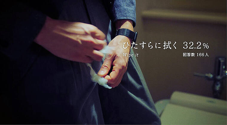 この動画制作チームは、30~60代 男性 516名に聞き込み調査。その結果、「下着からズボンへの尿のしみ出し」の隠し方で最も多い隠し方は「乾くのを待つ」(250票)で、次いで「乾かす」(178票)、「ひたすらに拭く」(166票)に。
