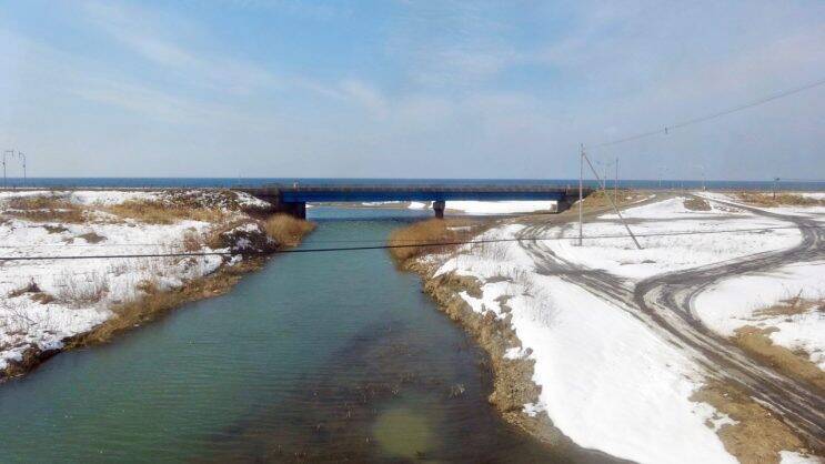 トップ画像は、江差の町に入る手前で椴川(とどがわ)を渡ります。国道228号線の向こうに日本海が見えます。