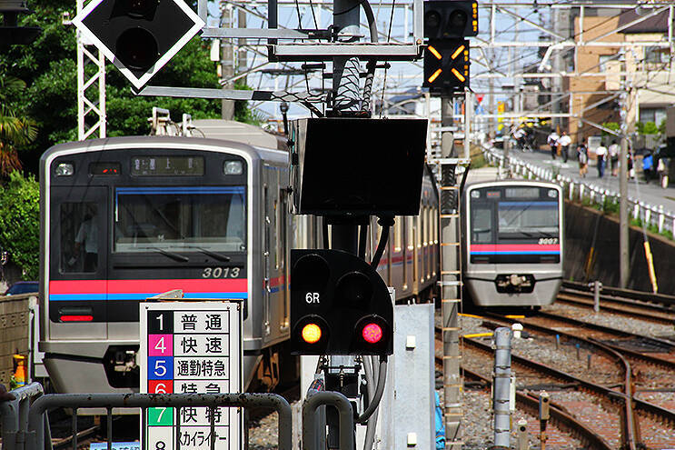 ↑↑↑画像で列車種別標識のとなりに、最上位が「AE」と記された標識がある。これが停車場間最高速度標識。↑↑↑画像でいうと、スカイライナー形式AEが100km/h、快速特急と特急が95km/h、通勤特急・快速・普通が90km/h。