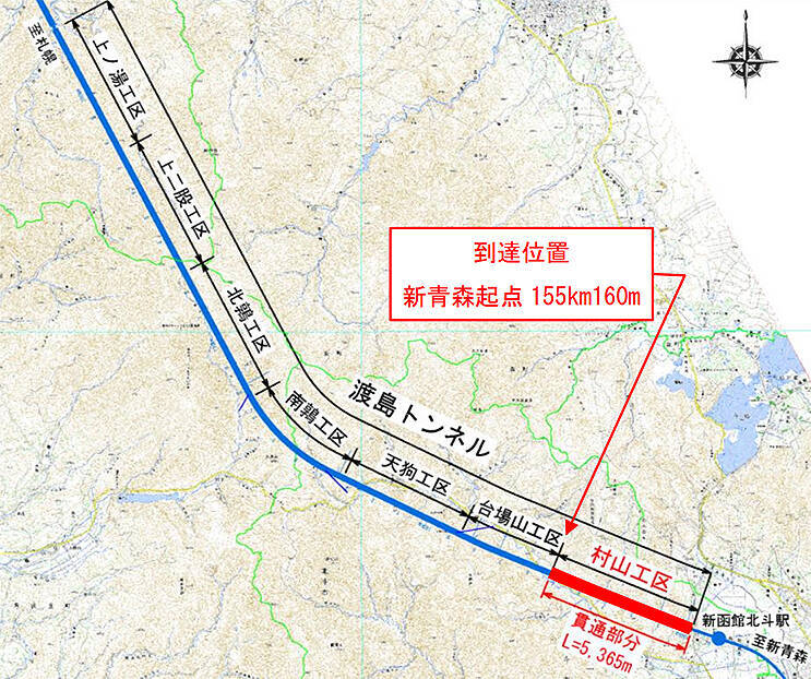 7工区に分けて工事をすすめるこの渡島トンネルのなかの、最も南側(新青森方)の村山工区(5.365km)の掘削が完了。