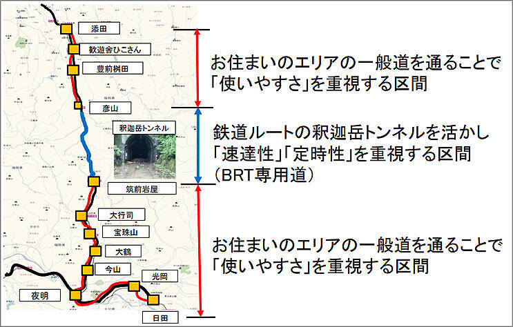 その不通 バス代行区間 添田~夜明について、JR九州は、不通区間の北側 添田~彦山と、南側の筑前岩屋~夜明~日田を一般道を経由するバス輸送、その間にある彦山~筑前岩屋をBRT(バス高速輸送システム)で結ぶ復旧案を提案。
