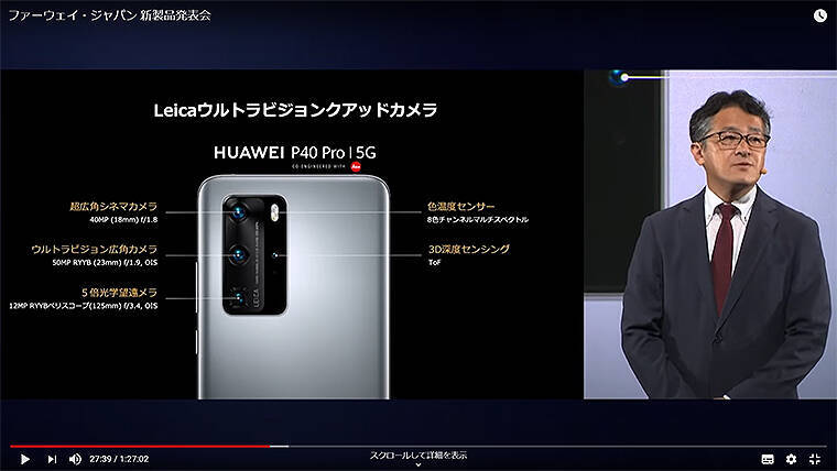 また、YouTube 新商品発表映像では、25分後からファーウェイ・ジャパン 阿部崇氏が、新商品の特長や優位性を解説。
