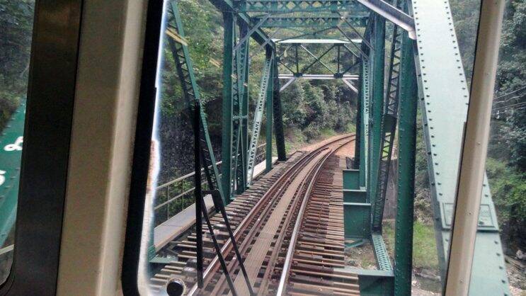 スイッチ・バックの坪尻駅にさしかかります。昨日の下り線は停車しましたが、今日の上り列車は通過します。待避線が右側に見えてきました。