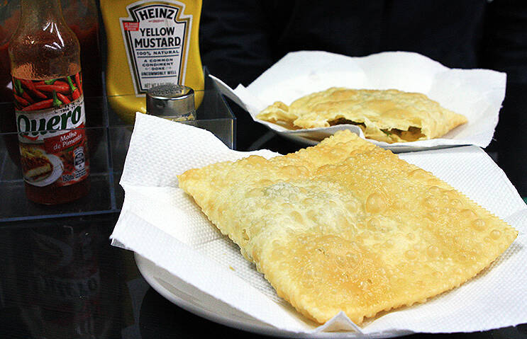 牛ひき肉のパステウ(pastel de carne)と、牛ひき肉とチーズのパステウ(pastel de carne com queijo)、そしてバカリャウが喰いたい!ってことで、魚クロケ(bolinho de bacalhau)を。ぜんぶで850円。