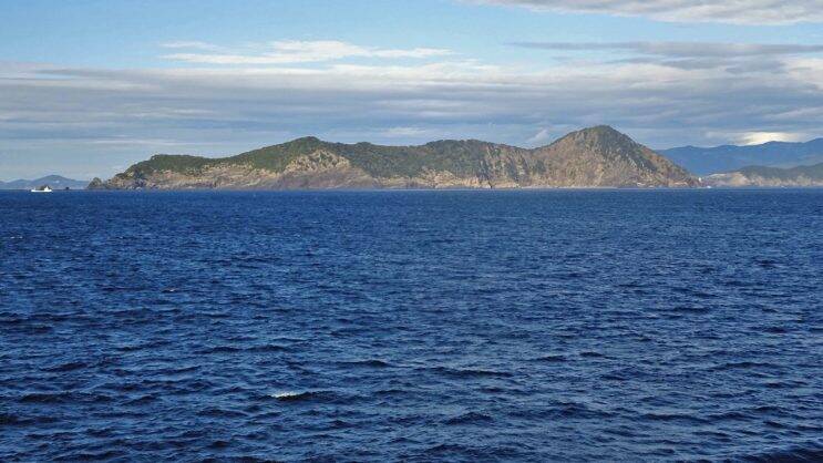 豊後水道中央部の無人島「水ノ子島(みずのこじま)」の灯台に最も近づいた時の望遠レンズ写真。凄い崖の上に灯台が建てられています。島は、周囲約300m、高さ約20m、面積0.34ヘクタールという島と言うよりも岩礁に近い小島です。南北に細長いのですがほぼ南側からの写真なのでとても小さく見えます。望遠レンズなので右奥には四国宇和島の御五神島らしき島も見えています。