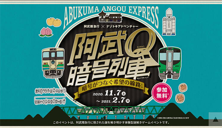 これを記念し、11月7日から、体験型謎解きゲームイベント「阿武隈急行×ナゾトキアドベンチャー 阿武Q暗号列車 ~暗号がつなぐ希望の線路(レール)」を開催。