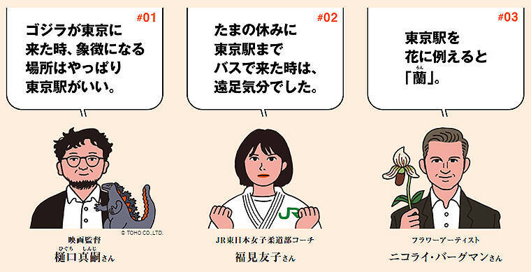 今回は、映画監督の樋口真嗣さん、JR東日本女子柔道部コーチの福見友子さん、フラワーアーティストのニコライ・バーグマンさん、フードエッセイストの平野紗季子さん、そして大相撲力士の炎鵬さんが登場。東京駅やスタートにまつわる想いを語ってくれた。