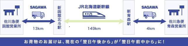 佐川急便は、北海道~本州の輸送ネットワークの効率化による配送品質の向上を図り、これまでより短いリードタイムで輸送できる新しいサービスの展開・実現をめざす。JR北海道は、北海道新幹線を有効活用できるという点で、両社は今後も事業化へむけて、検証を継続していく。