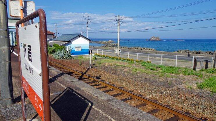 三保三隅駅を出発した山陰本線上り列車は、北上して今浦トンネルを抜けると日本海沿いを走ります。浦港を過ぎて遠くに鞍島が見えてきたら折居駅も近い。