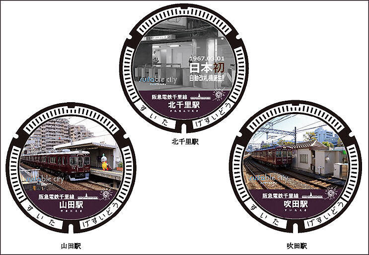 今回の阪急電鉄とのコラボでは、北千里駅・山田駅・吹田駅に続き、残る同市内にある阪急電鉄の4駅、南千里駅・千里山駅・関大前駅・豊津駅をデザインしたマンホール蓋も、順次設置していく予定。
