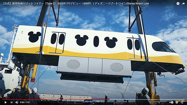 そのヒントになる光景が、東京ディズニーリゾート公式(TokyoDisneyResortOfficial)You Tubeの「【公式】新型車両リゾートライナー(Type C) 2020年7月デビュー!(85秒) | ディズニーリゾートライン/Disney Resort Line」に映っている。