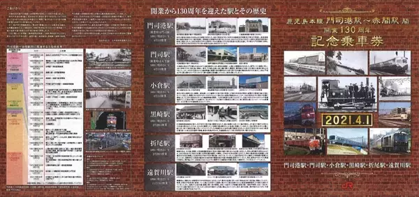 JR九州は鹿児島本線の門司港駅(当時は門司駅)~赤間駅間が2021年4月1日に開業130周年を迎えることから、「鹿児島本線門司港駅~赤間駅間 開業130周年記念乗車券(硬券)」を発売します。