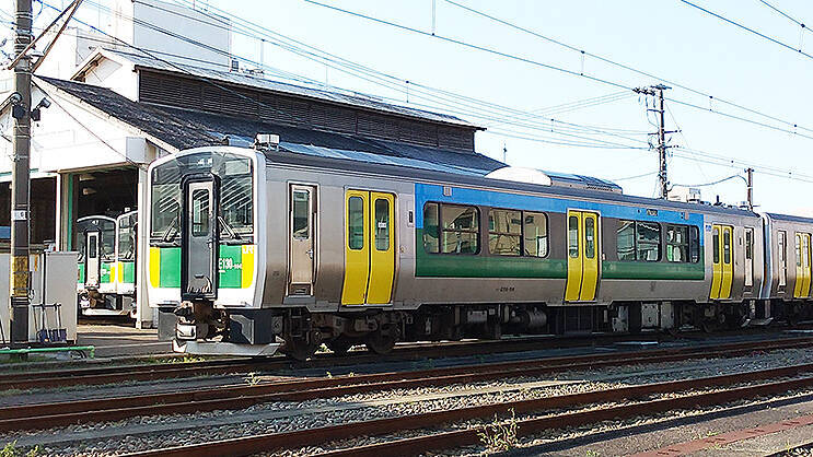 水郡線を行くキハE130系は、この画像の路線でも走っている。ってことでこの画像からクイズ。(1)この駅は? (2)この車両基地の名は?