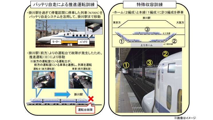 今回は地震によって静岡駅~掛川駅間の一部区間で停電が発生し、長時間運転を見合わせた場合を想定。東海道新幹線「N700S」のバッテリ自走による推進運転訓練を初めて実施するほか、ホームに2編成、本線に1編成の計3編成を停車させる特殊収容訓練も行う。