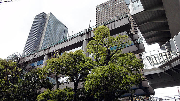上の画像は2021年4月13日。浜松町駅と旧芝離宮の間のスペースに巨大な鉄骨構造物が出現している。地上3階建ての新駅舎にむけた基礎工事だ。