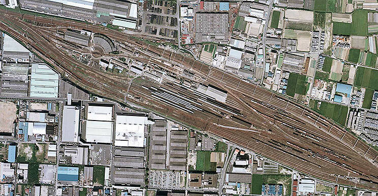 貨物操車場があったからか、この機関区の北側に大きな物流倉庫がみえる。ここはいま日本通運大阪南支店。その東(右)にはクボタや日本板硝子などの拠点がある。