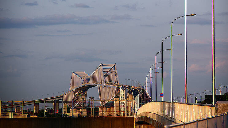トラスとアーチが織り成す鉄橋の姿にみとれていると、ごごんごごんと京葉線の電車がかけぬける姿。
