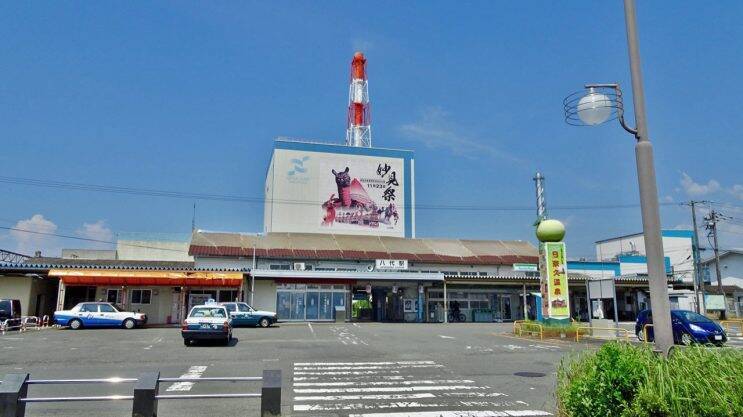 14時4分、鹿児島本線川尻駅に到着。まずは駅舎正面。駅前にはロータリーがあります。
