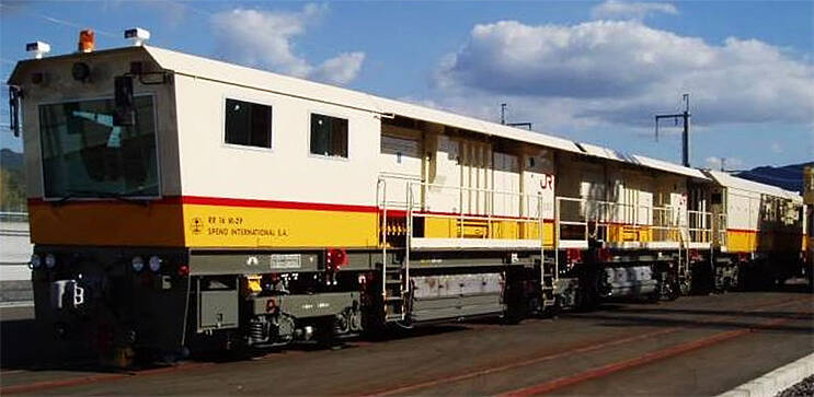 スペノ製レール削正車は、3両編成で全長38メートル、重量120トン、最高速度は70km/h、作業時速度は4~6km/hで、床下にある16個の砥石でレール頭部をひと晩あたり700mほど削正できる。