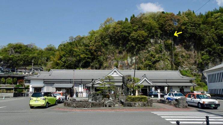 トップ画像、駅舎背後の崖から流れ落ちている滝です。分かり難いので黄色い矢印を付けました。(付けても分からない?)滝はコラム中にも登場します。