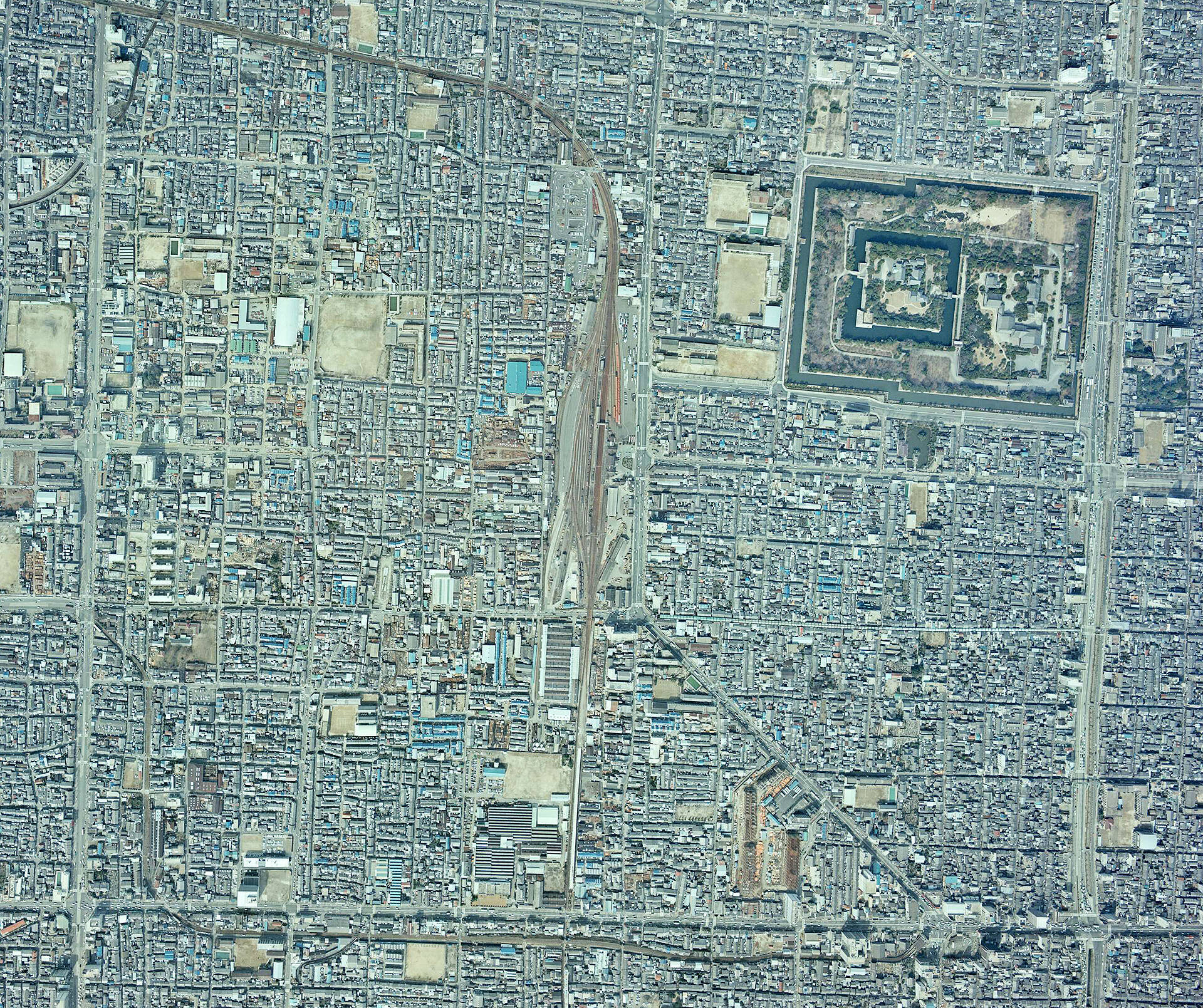 2枚の画像↑↑↑は国土地理院1975年の写真。現在の二条駅西側にあるBiVi二条ショッピングモールを含む一角に、貨物ヤードが広がっていた。