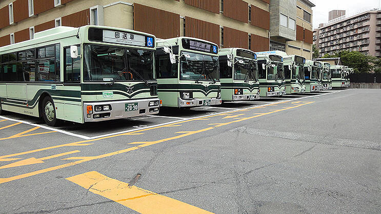 その名のとおり、この壬生車庫前交差点の西側に、京都市交通局 市バスみぶ操車場がある。