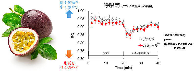 ―――本研究では、20~40代の健康な成人男女9名を対象に、安静時、および日常活動レベルの運動時の呼気ガスを測定し、脂肪の燃焼割合(脂質代謝比率)の変化を、対照食(プラセボ)摂取の場合と比較した。