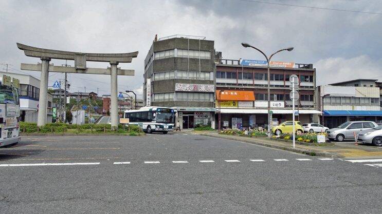 能褒野神社一の鳥居は変わりません。長年見慣れた駅前の古いビルが解体されていたのです。これは2018年の駅前風景。