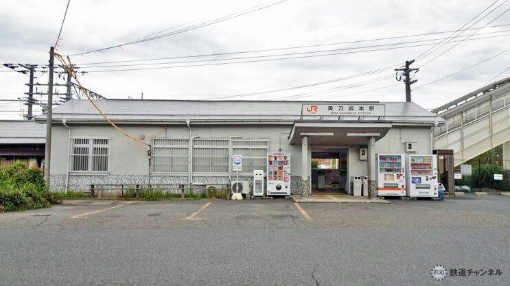 西側から駅舎。手前の茶色い部分も駅舎ですが、壁面が異なっています。駅前広場は美乃坂本駅月極駐車場になっています。