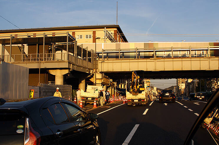 画像は梅小路京都西駅。この先、画像の右側に、ザ ロイヤルパークホテル 京都梅小路とスターバックス コーヒー ビバスクエア京都 梅小路公園店がある。