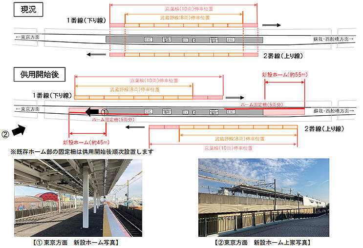 このホーム延伸部供用開始にあわせて、上下線ともに京葉線(10両)は約2両ぶん、武蔵野線(8両)は約3両ぶん列車停車位置をずらす。