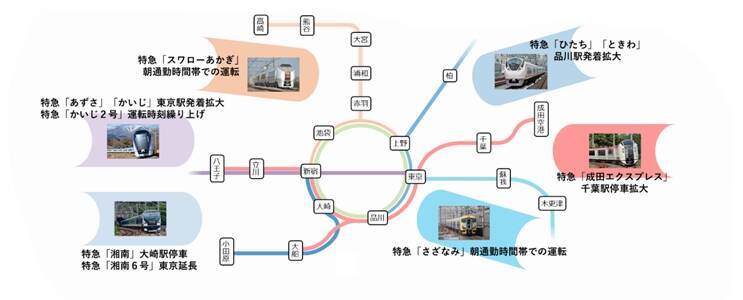在来線特急は、朝通勤時間帯の高崎線「スワローあかぎ」と京葉・内房線「さざなみ」を運転、東海道・山手線の「湘南」は新たに大崎駅に停車させ、着席サービスを向上させます。成田空港アクセスの「成田エクスプレス(NEX)」も、千葉停車列車を上下計で現行7本から29本と大幅に増やします。