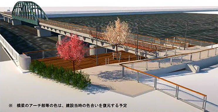 東京都は、この晴海鉄道橋の耐震補強工事の状況を動画で公開。残存する線路の路盤を埋めて、段差がない歩道をつくる計画や、鉄骨アーチ部橋梁は錆などを落としたあとに建設当時の色合いにあわせた塗装を施すとも伝えている。