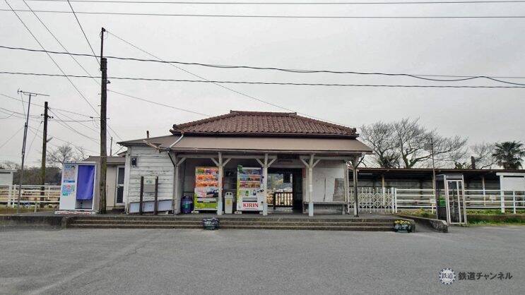 「開業当初からの駅舎。大正14年頃の建築。設計・施工は鹿島組(現・鹿島建設株式会社)。木造平屋、寄棟造。屋根は瓦葺き、外観は洋風下見板張り。昭和7年頃に小規模な増改築。待合室・事務室部分に大きな改築はなく出札口、手荷物扱いカウンター、北側窓際ベンチ、内壁堅板張り腰板や天井など内外観は開業時の佇まいを伝える。」