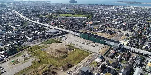 それは、海側の車窓。画像↑↑↑は大村市が公開している新大村駅の上空画像。奥に大村湾や長崎空港がみえる。