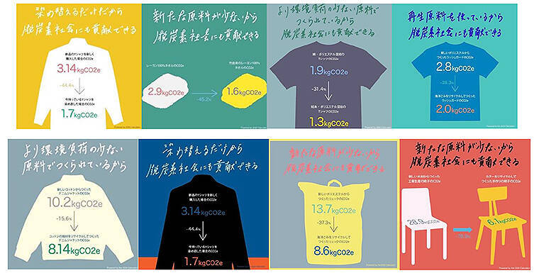 各商品の環境負荷の少ない素材や手法を、従来の素材や手法と比較したCO2e削減量を記載し、その商品を購入することで、購入者がどれくらい脱炭素に貢献できたかを具体的な数値を見て実感できる。