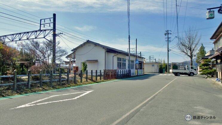 道路標識が一部入ってしまいました。駅舎の前はT字路、右に丸七旅館、左は清涼飲料水の自動販売機が並ぶ商店がありました。
