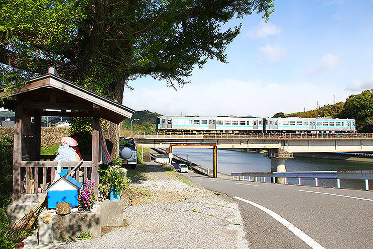 この伊野線を行く時間はまた別で記すとして、国道33号 高知西バイパスを渡って、鏡川右岸を行く県道273号を歩いていると、土讃線の線路がみえてきたあたりに、大きな木の下にお地蔵さんがいる。