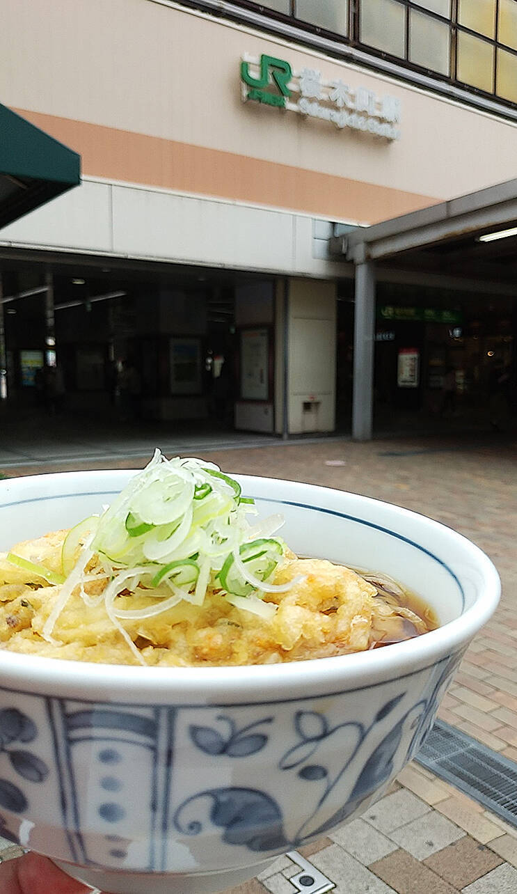 駅前を行き交う人たちの人目を気にしなければ、涼しい風にあたりながら、電車の足音、発車メロディを聞きながら、熱々のそばを、やれる。