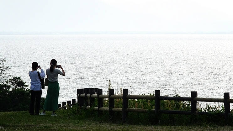 いつも女子ふたりやカップルの姿があるここは、島根県 松江市 玉湯町林、宍道湖の夕日を全身で体感できる、宍道湖ふれあいパーク。