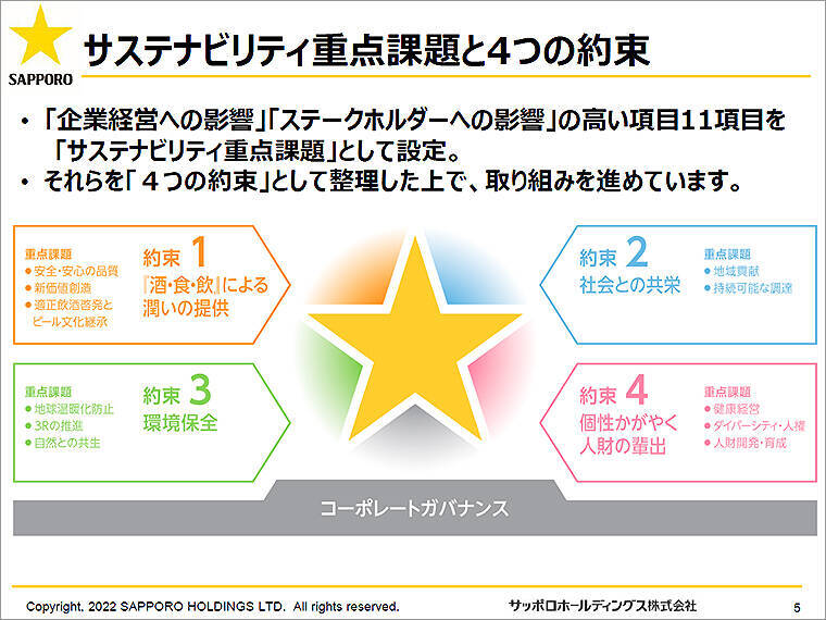 サッポロホールディングスは8月3日、「サッポログループ サステナビリティブック 2022」にもとづく取り組みの軸となるサステナビリティ重点課題「4つの約束」を公開。